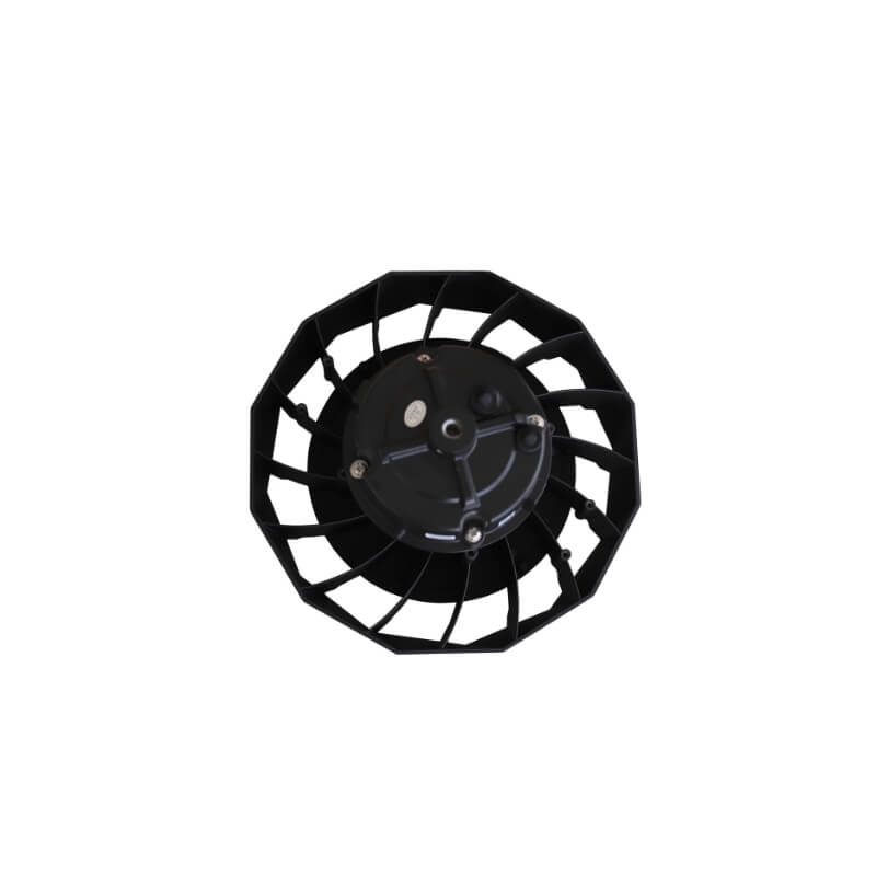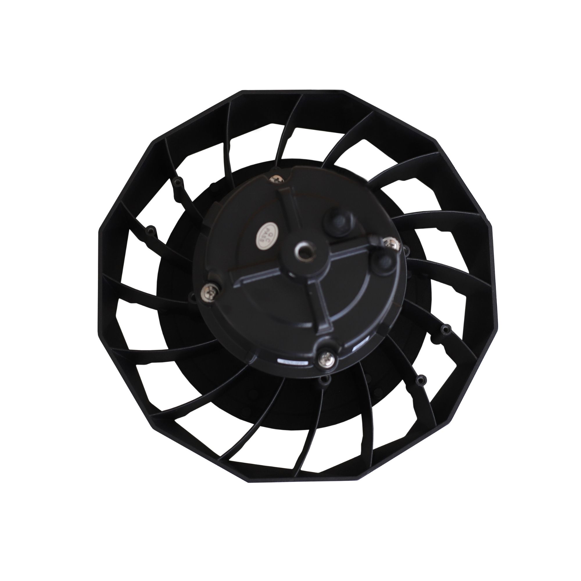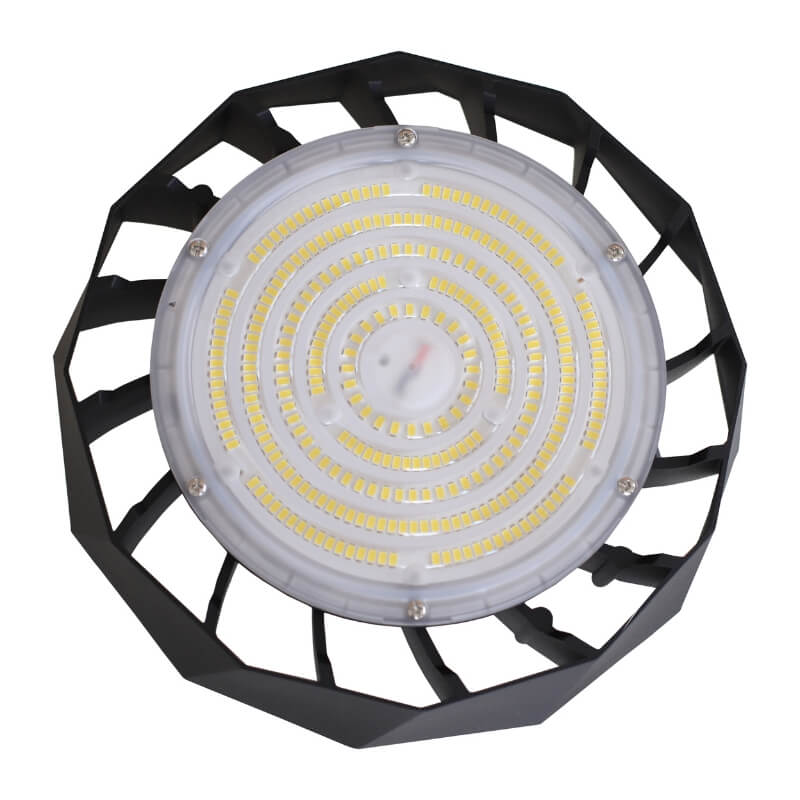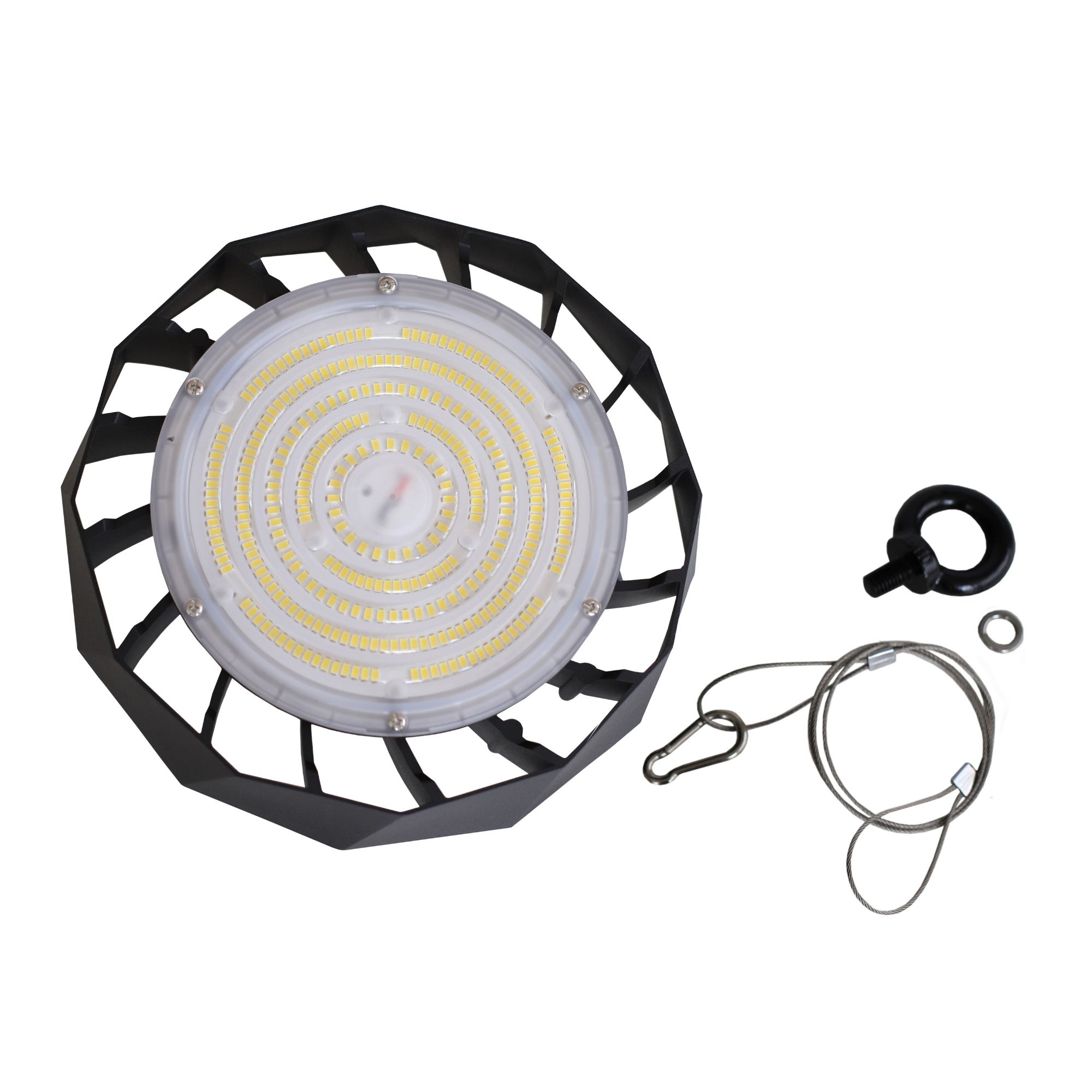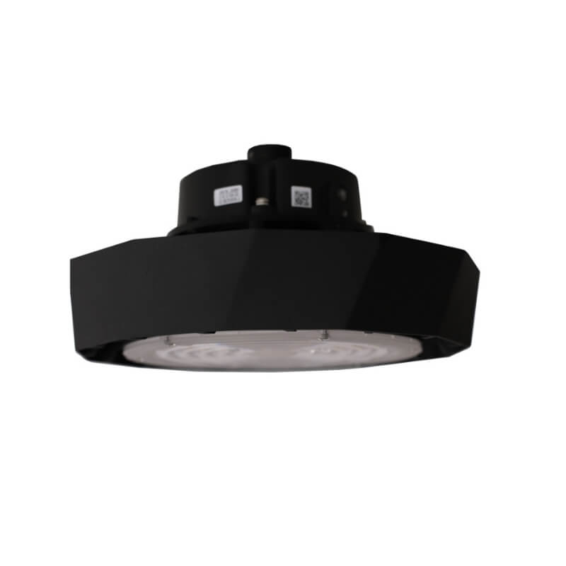 High Bay LED luminaires for general use with a lifespan of 50,000 hours and a body treated for infrared and ultraviolet rays with anti-corrosion electrostatic paint in black.